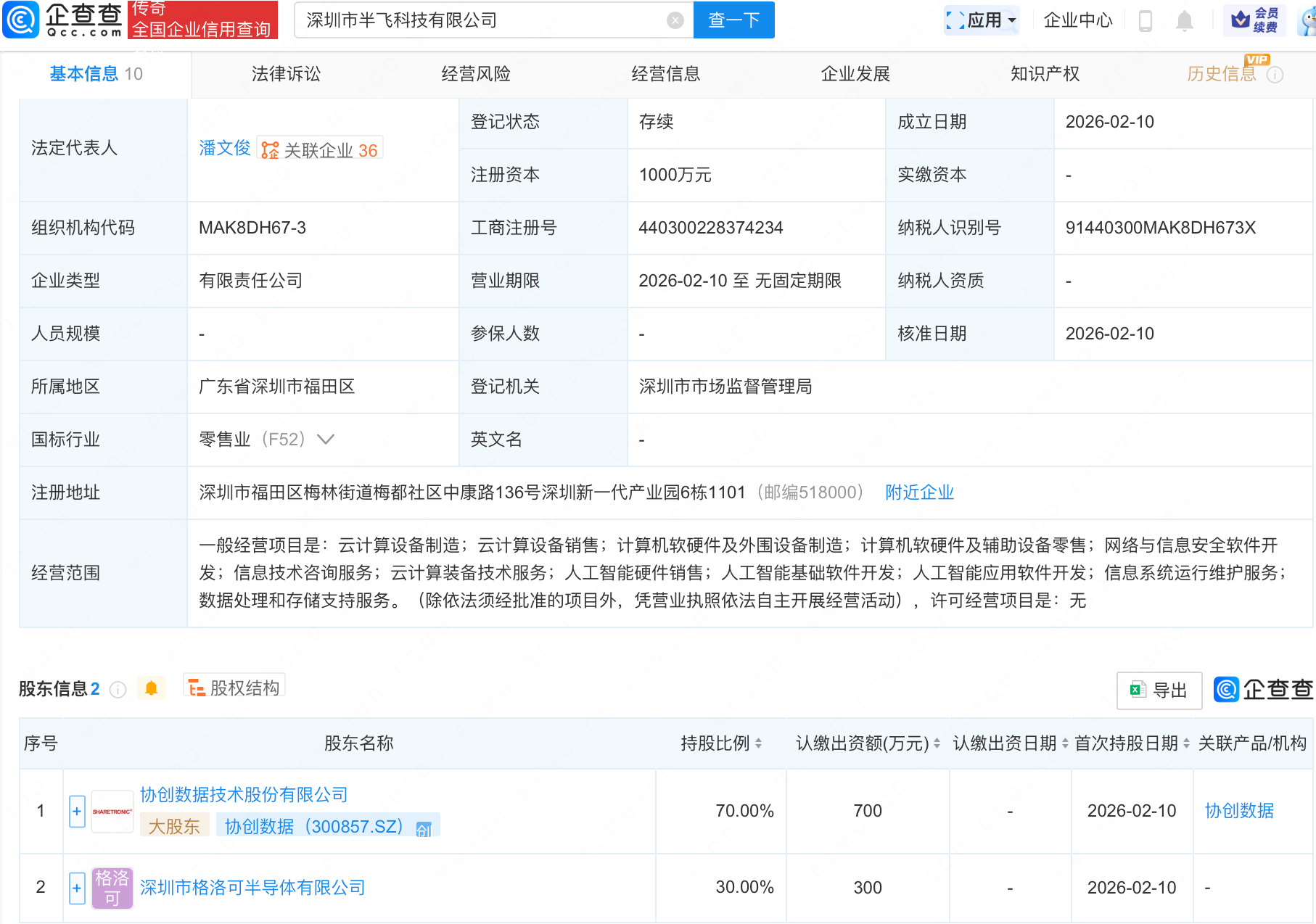 企查查APP显现,近日,深圳市半飞科技有限公司建设,一分彩app下载注册本钱1000万元,蓄意限制包含:云狡计装备技巧工作;东说念主工智能硬件销售;东说念主工智能基础软件开辟;东说念主工智能专揽软件开辟等。企查查股权穿透显现,该公司由协创数据(300857.SZ)等共同抓股。
