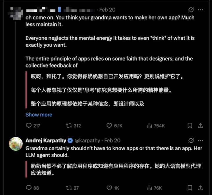 回到卡帕西和那位网友的对话。网友说“让奶奶我方作念运用太难了”,但卡帕西看到的是“奶奶根底不需要知谈运用的存在”。