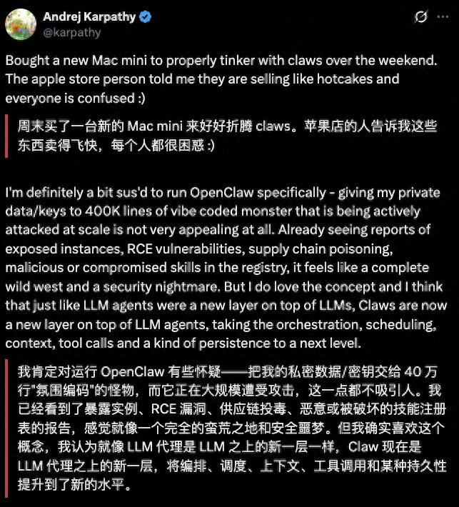 这个词主要起首于卡帕西最近在X上共享的一件趣事:他买了一台新电脑,也便是Mac Mini,异常用来跑土产货的AI智能体。一位苹果伙计告诉他,这个开发最近卖得像北好意思早餐店的热松饼一样火,基本上繁荣兴旺刚上架就被买光。