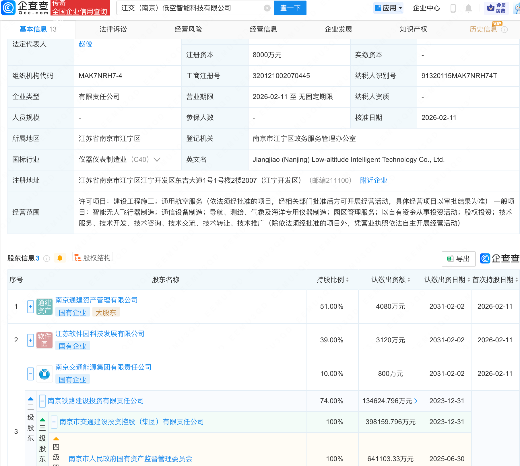 企查查APP理解,近日,江交(南京)低空智能科技有限公司拓荒,一分彩app官方下载注册老本8000万元,商量范围包含:智能无东说念主遨游器制造;通讯拓荒制造;导航、测绘、欢欣及海洋专用仪器制造等。企查查股权穿透理解,该公司由南京交通动力集团有限株连公司等共同捏股。