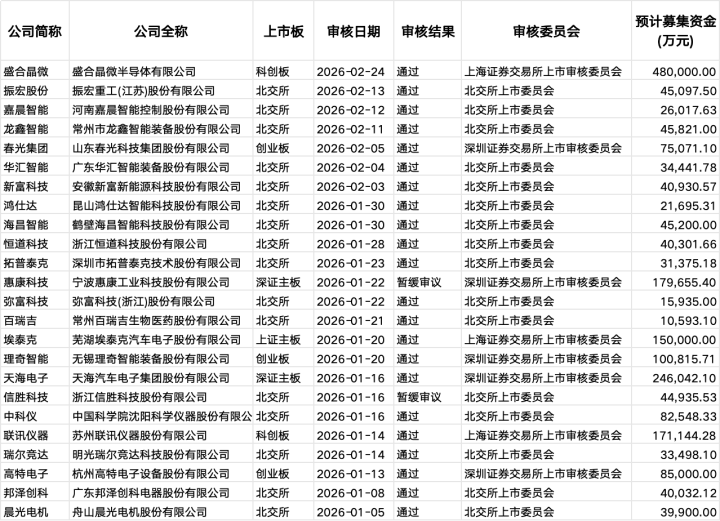 其中,春节假期前接踵过会的3家企业常州市龙鑫智能装备股份有限公司、河南嘉晨智能适度股份有限公司、振宏重工(江苏)股份有限公司,均是在去年6月获受理,均拟登陆北交所,从受理到过会用时约8个月。