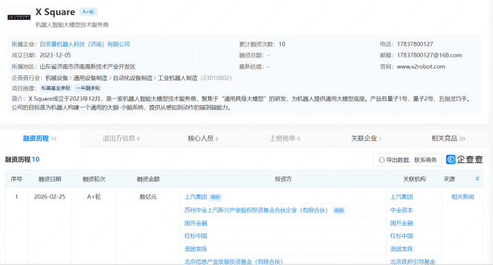 投资界(ID:pedaily2012)2月26日音书,据企查查,自变量机器东谈主(XSquareRobot)完成数亿元新一轮融资,本次融资由上汽金控、中金上汽基金等头部产业成要领投,好意思团龙珠、红杉中国、北京信息产业发展投资基金、国开金融、啟赋成本、渶策成本、广发信德等浩大老推动整个加码追投。