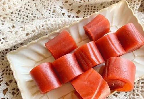炒好的果泥倒在油纸上,摊平晾凉。凉透后轻轻揭下油纸,把果泥卷起来,切成小卷,果丹皮就大功获胜了!每块果丹皮酸甜适中,嚼着有弹性,孩子吃一口就爱上,大东说念主吃着也过瘾。